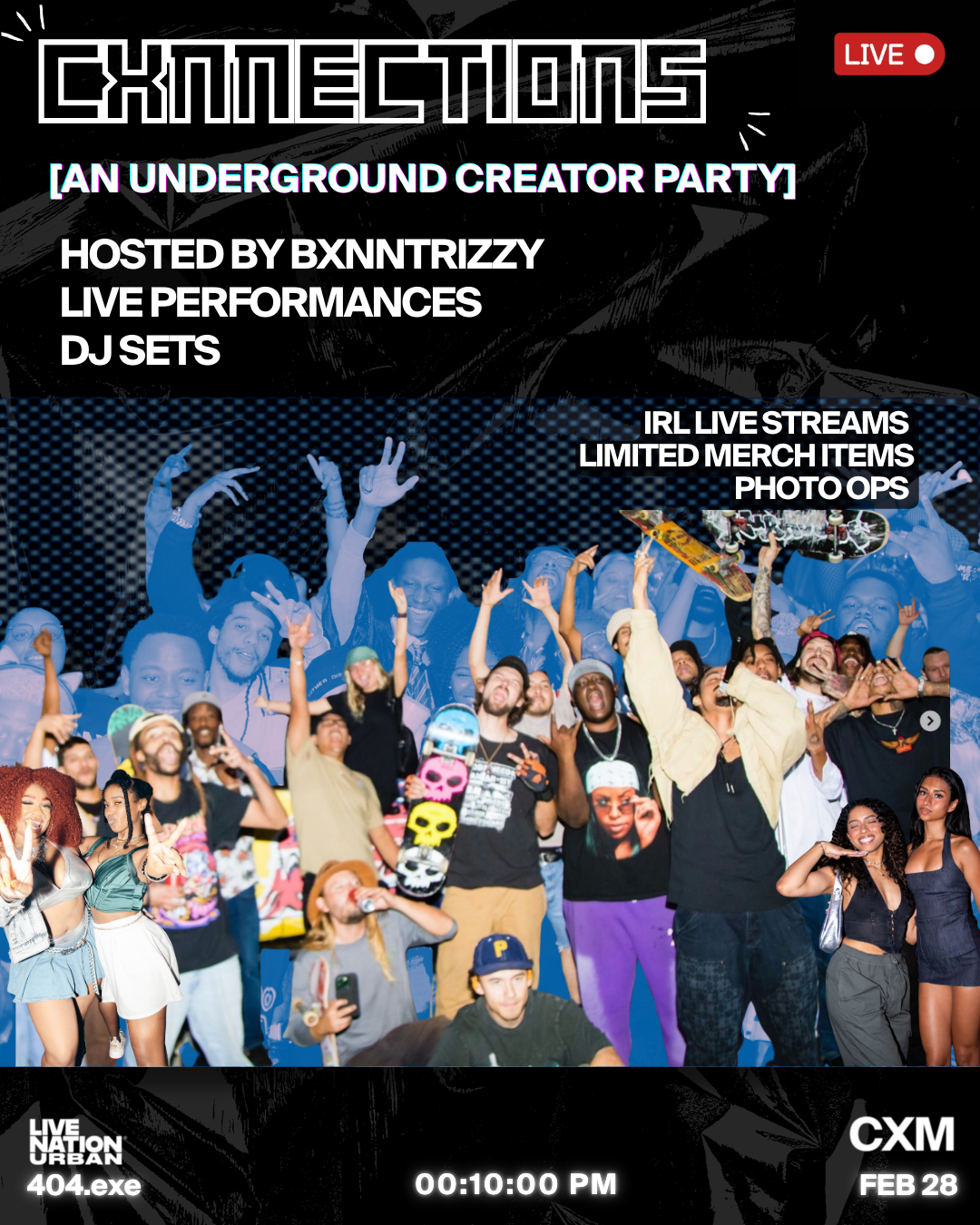 CXNNECTIONS a night built for streamers, gamers, DJs, creatives, artists, and internet kids who live online but still want real-life energy. No fake conversations. Just loud sound, packed rooms, and people who move culture every day.