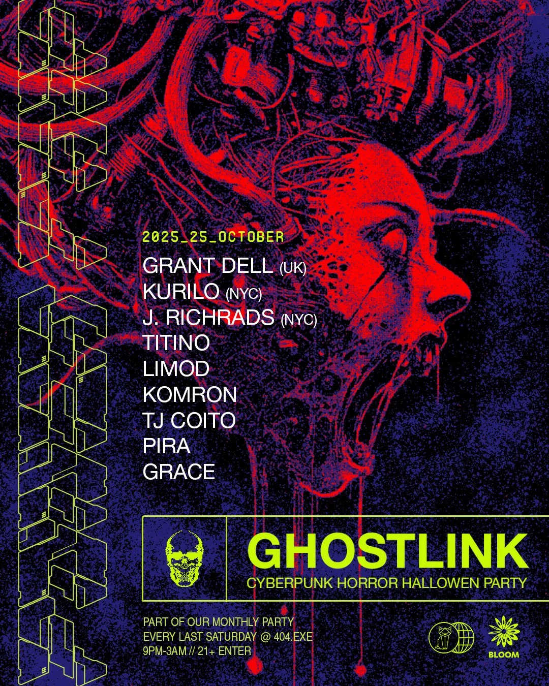 For one night, our monthly Power Trip becomes GHOSTLINK—a dystopian bar of the future. Two rooms. Full immersion. We're transforming 404.exe into a world where the line between human and machine blurs, where the future feels both thrilling and terrifying.