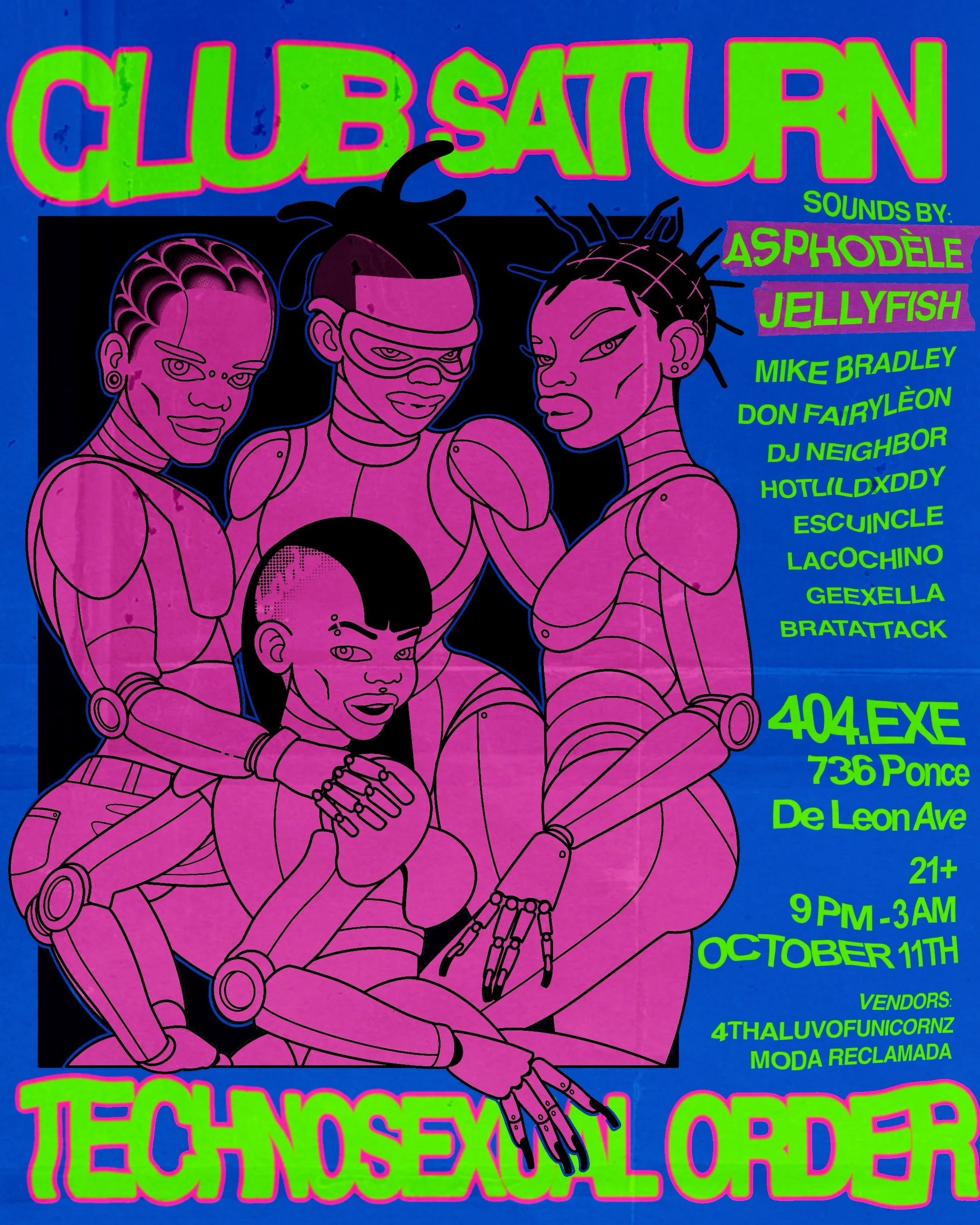 Saturday, October 11th, 2025. We’re so ecstatic to announce the collaborative Pride soirée between Technosexual Order && Club Saturn. We’re calling all the Queers to the dancefloor for another hot and sexy body stimulating night of dancing. We’re sooo excited to welcome from Pittsburgh the Atlanta Debut of the electrifying duo Jellyfish. Their sets morph between Italo, house, melodic techno, disco, electro, and beyond! So come prepared to sweat it out! All the way from LA, we have the Atlanta debut of the incredible sound technician herself Asphodèle. Her Sound is creative, experimental, heartfelt, genre bending, high energy and we are too excited to get lost on the dancefloor to Asphodèle’s selections. All these amazing artist on this lineup bring something very special. The music will consist of melodic, rhythmic, hypnotic patterns of club, jersey club, techno, electro, footwork, hard drums, electronica, grooves, experimental and so on. Shaking it all night!
